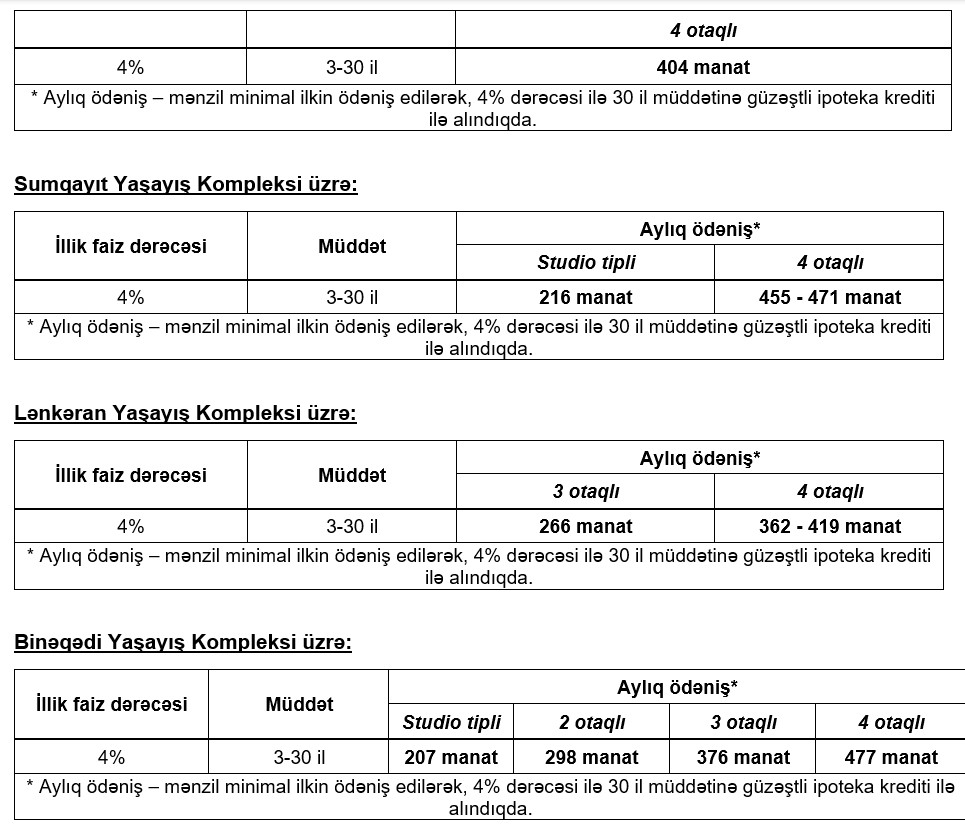 Bu elan çərçivəsində mənzillərin satışı həm ipoteka kreditindən istifadə etməklə, həm də öz vəsaiti hesabına ödəniş üsulu ilə nəzərdə tutulmuşdur.