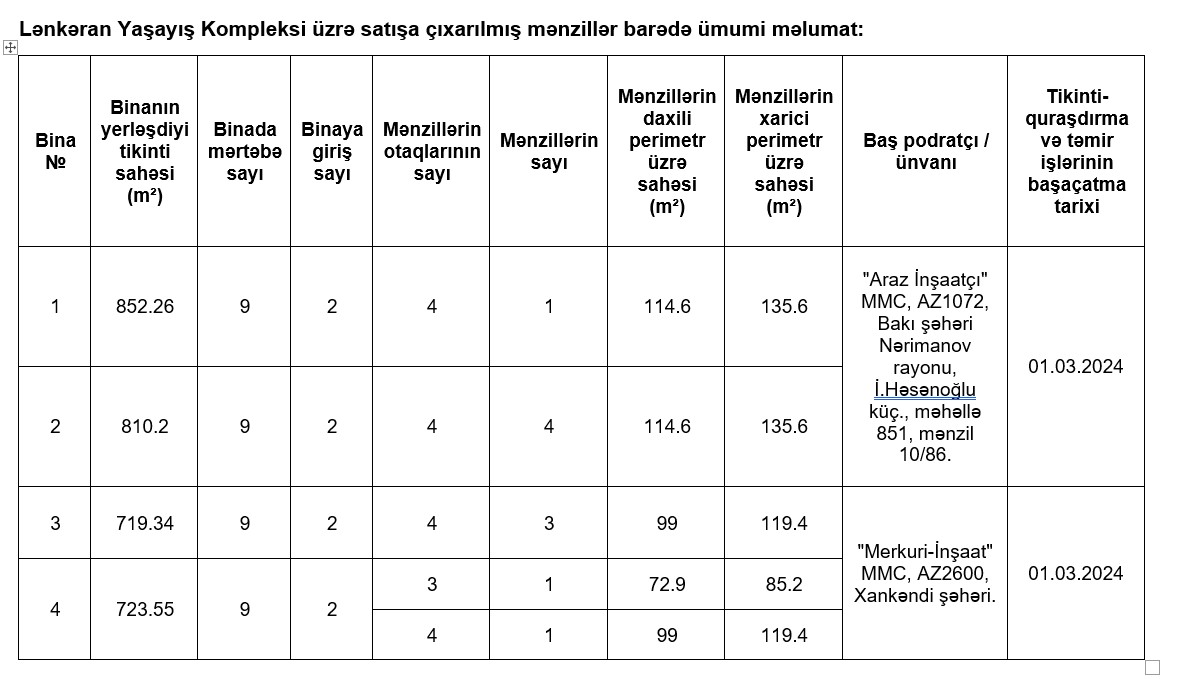 Satışa Hövsan Yaşayış Kompleksinin birinci mərhələsi üzrə 1, Hövsan Yaşayış Kompleksinin ikinci mərhələsi üzrə 7, Sumqayıt Yaşayış Kompleksi üzrə 10, Lənkəran Yaşayış Kompleksi üzrə 10, Binəqədi Yaşayış Kompleksi üzrə 204, Şirvan Yaşayış Kompleksi üzrə 216, Yevlax Yaşayış Kompleksi üzrə 179 mənzil olmaqla, ümumilikdə 627 mənzil çıxarılır. Bütün mənzillər tam təmirli, mətbəx mebeli, kombi isitmə sistemi (kombi cihazı daxil olmaqla), su, qaz və elektrik sayğacları ilə təmin edilmiş vəziyyətdə təklif olunur.