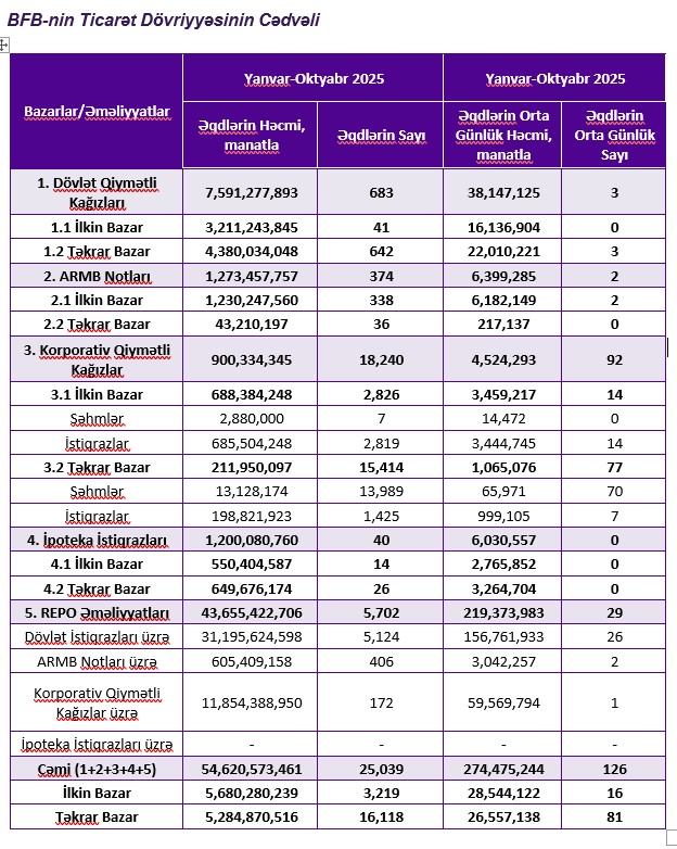 Ticarət dövriyyəsinin 80%-i və ya 43 milyard 655 milyon 423 min manatı REPO əməliyyatları ilə bağlı olub.