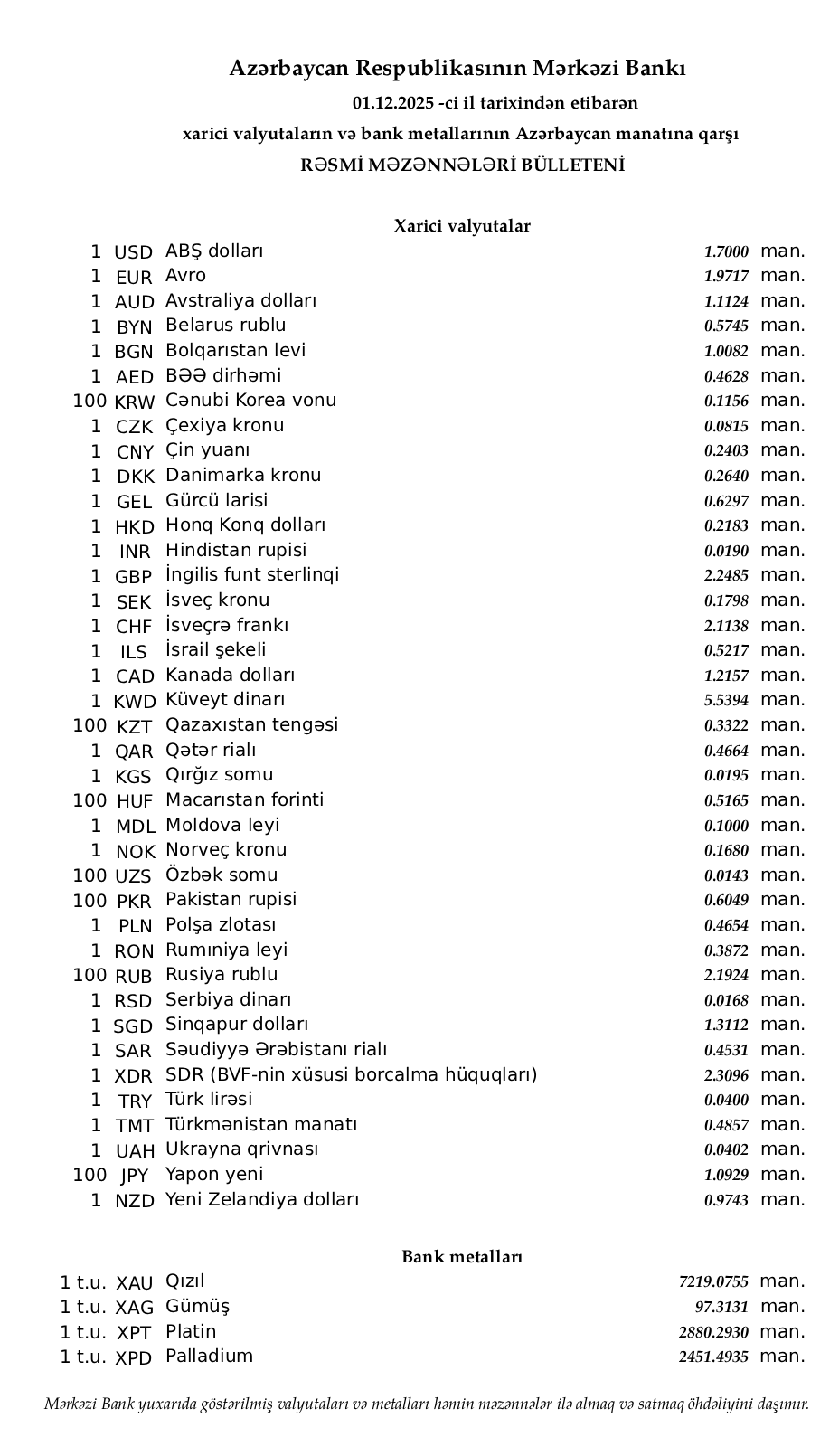 Rəsmi məzənnələr açıqlandı