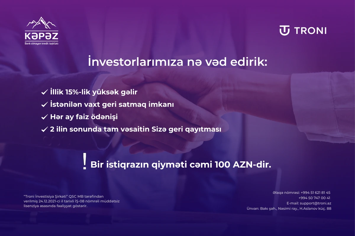 Məlumat üçün deyək ki, "Troni İnvestisiya Şirkəti” QSC qiymətli kağızlar bazarında əsas və yardımçı investisiya xidmətlərini göstərən peşəkar investisiya şirkətidir. Şirkət 24 dekabr 2021-ci il tarixində Mərkəzi Bank tərəfindən verilmiş İŞ-08 nömrəli müddətsiz lisenziya əsasında fəaliyyət göstərir.