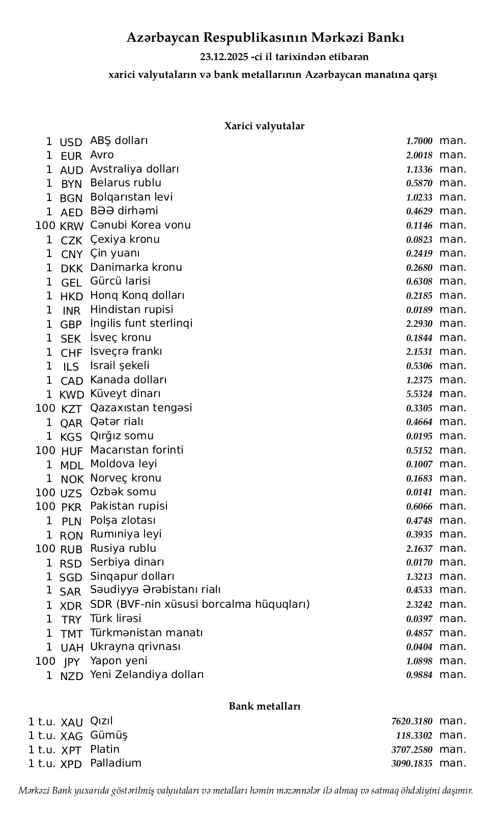 Rəsmi məzənnələr açıqlandı