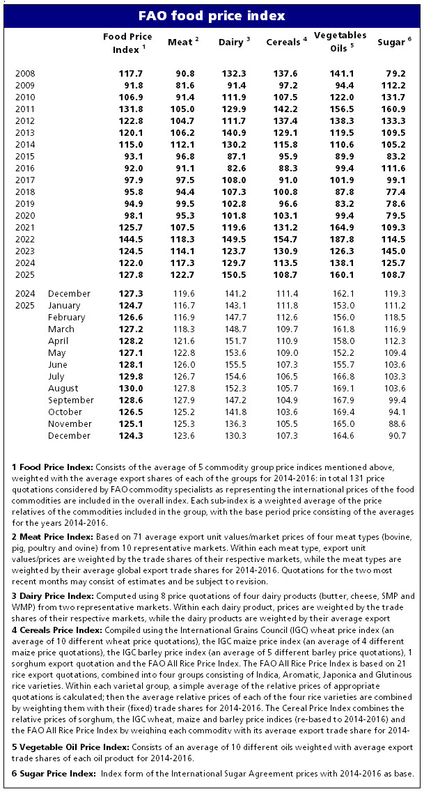 FAO Şəkər Qiymətləri İndeksi ardıcıl üç aylıq azalmadan sonra dekabrda aylıq müqayisədə 2,4 faiz artıb, lakin bir il əvvəlki səviyyəsindən 24 faiz aşağıda qalıb. Artım Braziliyanın əsas cənub istehsal bölgələrində şəkər istehsalının kəskin azalması ilə bağlı olub. Bununla belə, Hindistanda müsbət məhsul və istehsal gözləntiləri qlobal şəkər təklifinin bol olacağına dair gözləntiləri gücləndirib və qiymətlər üzərindəki yüksəliş təzyiqini məhdudlaşdırıb. 2025-ci il üzrə FAO Şəkər Qiymətləri İndeksi orta hesabla 104,3 bənd olub və 2024-cü illə müqayisədə 17,0 faiz azalaraq 2020-ci ildən bəri ən aşağı illik səviyyəni qeydə alıb.