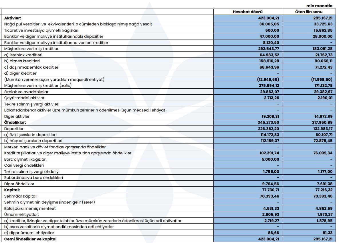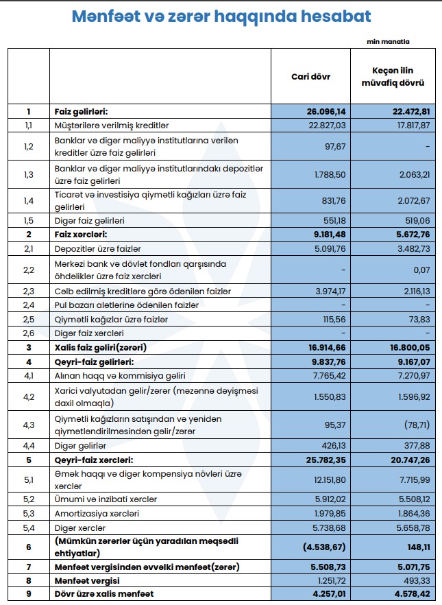 Buna baxmayaraq, Bankın əməliyyat mənfəəti 971 min manat olub. Bu göstərici 2024-cü ildəki 5 milyon 72 min manatla müqayisədə 4 milyon 101 min manat və ya 80,8% azdır.