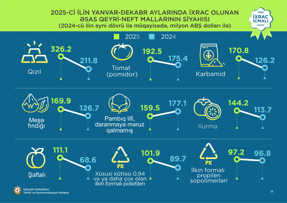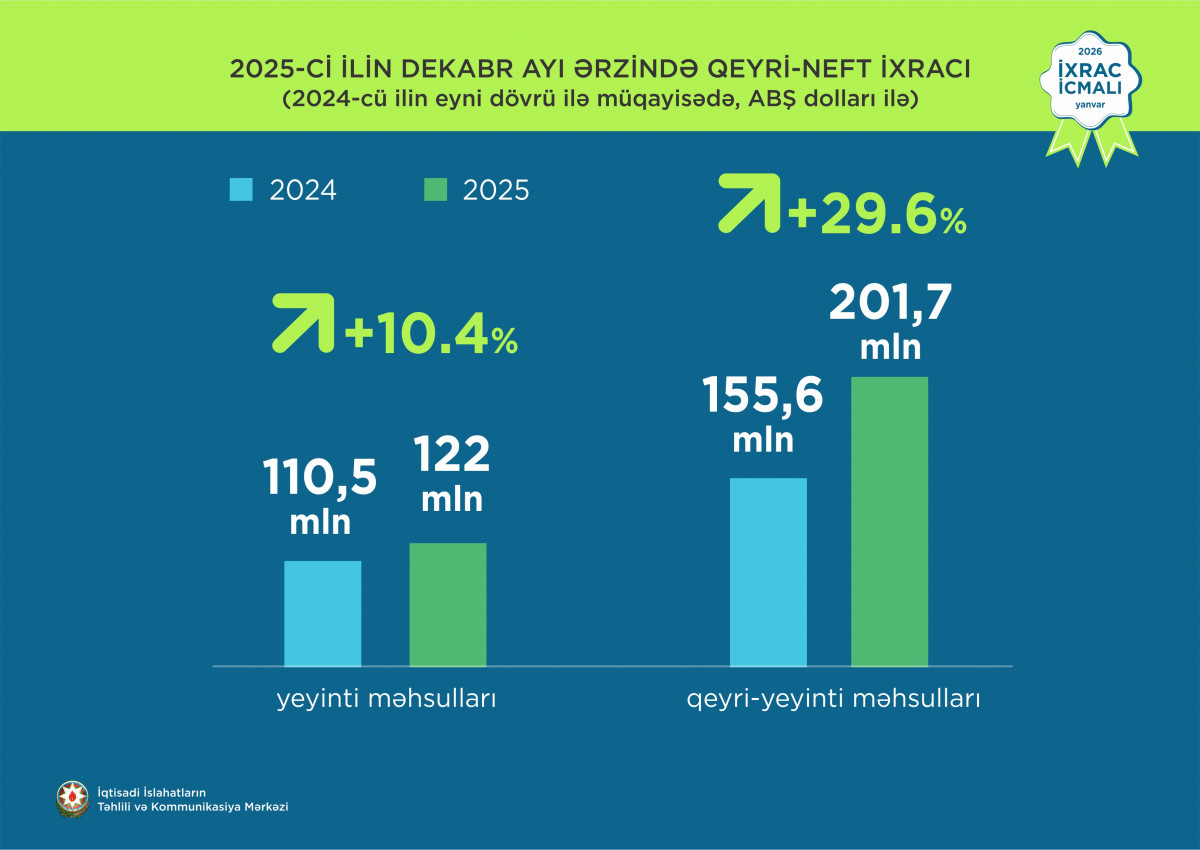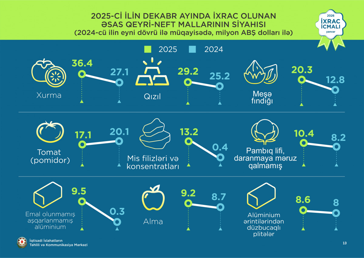 2025-ci ilin dekabr ayı ərzində ixrac edilmiş qeyri-neft sektoruna aid malların siyahısında xurma  (36,4 milyon ABŞ dolları) birinci olub. Bu siyahıda qızıl (29,2 milyon ABŞ dolları) ikinci, qabığı təmizlənmiş meşə fındığı ( 20,3 milyon ABŞ dolları) isə üçüncü yerdə qərarlaşıb.