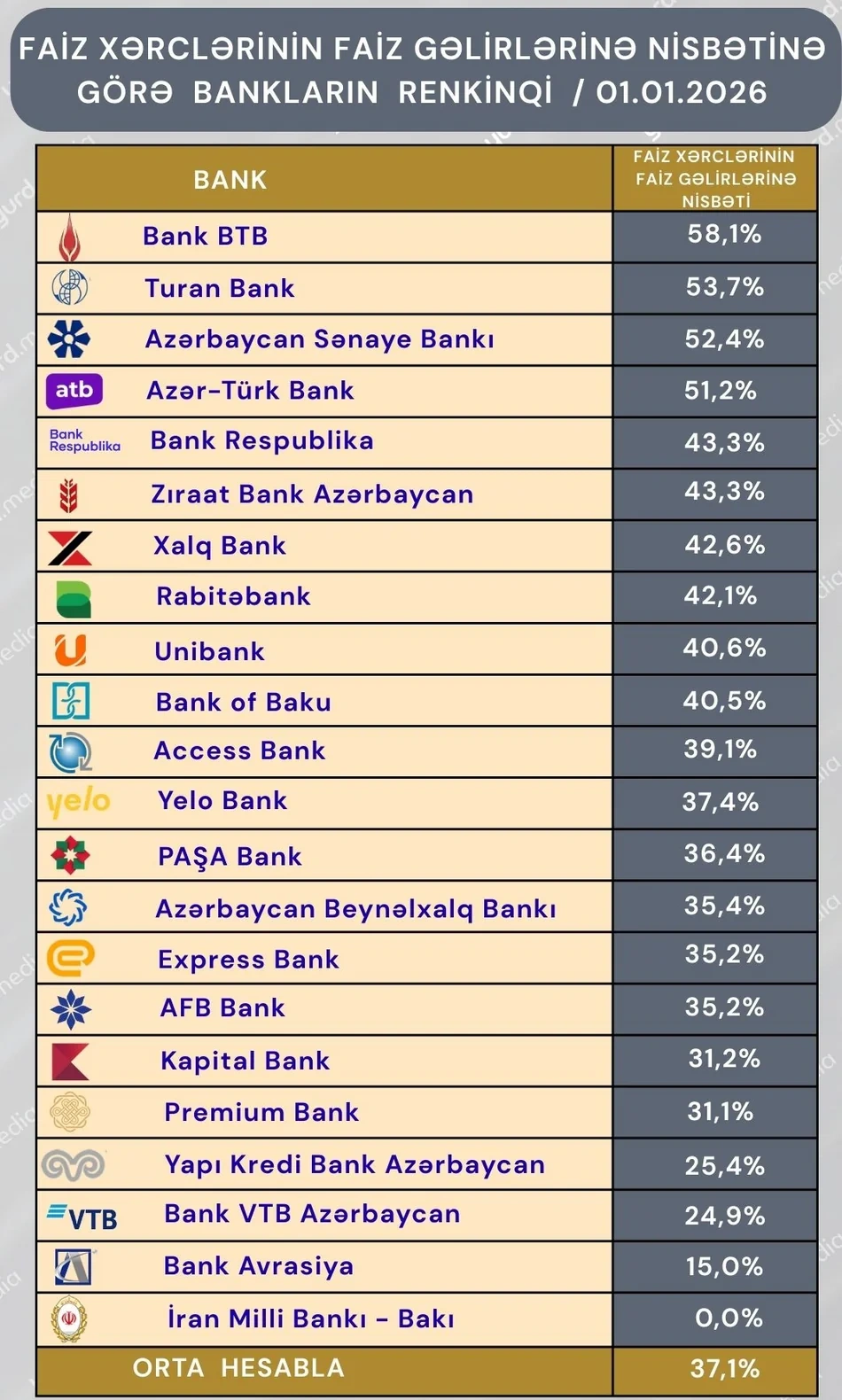 2025-ci ildə Azərbaycan banklarının cəmi faiz xərcləri onların cəmi faiz gəlirlərinin 37,1%-i qədər olub.