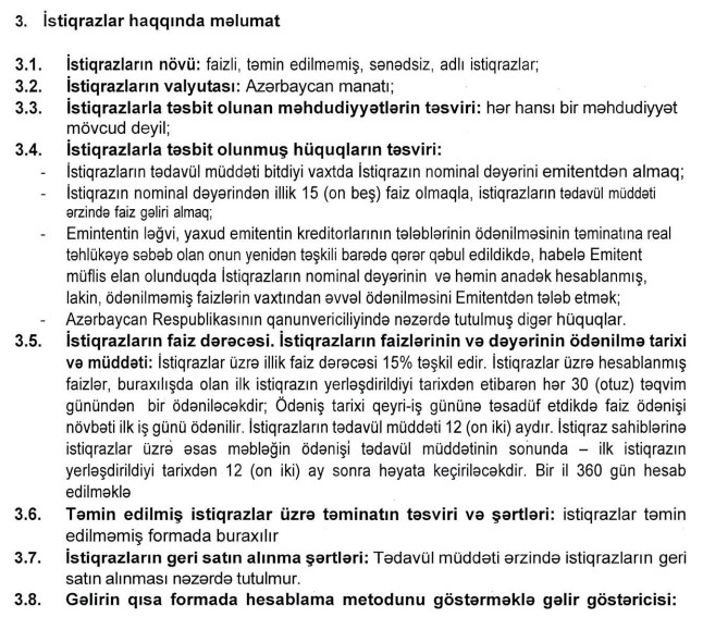 İstiqrazlar üzrə illik faiz dərəcəsi 15%, tədavül müddəti 12 ay, faiz ödəniş dövrünün müddəti 30 gündən birdir.