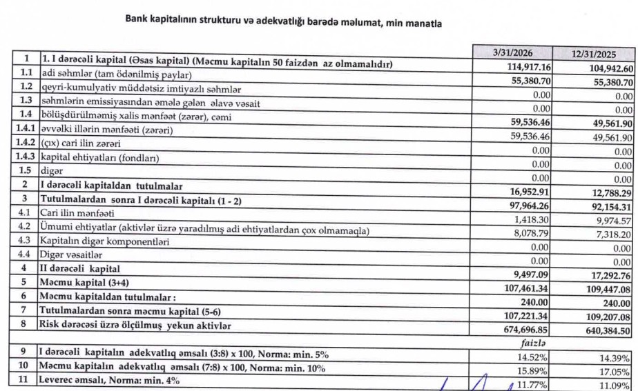 "Yapı Kredi Bank Azərbaycan" QSC 2026-cı ilin ilk rübü üzrə (yanvar - mart) maliyyə nəticələrini açıqlayıb. Hesabata əsasən, bankın mənfəəti azalsa da, kredit portfeli və kapital mövqeyi artım nümayiş etdirib.