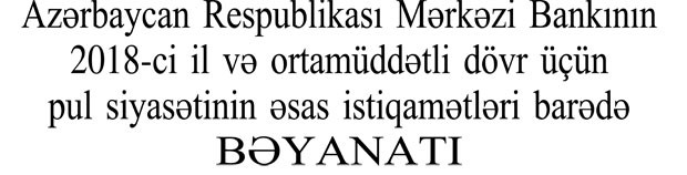 "Marja" xəbər verir ki, bu. Azərbaycan Respublikası Mərkəzi Bankının 2018-ci il və ortamüddətli dövr üçün pul siyasətinin əsas istiqamətləri haqqında Bəyanatında deyilir.