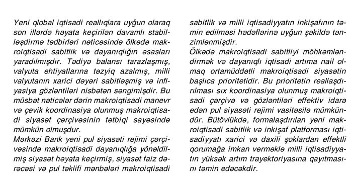 "Proqnozlaşdırılan neft qiymətləri ilə (45 dollar) tədiyyə balansının cari əməiyyatar hesabında profisitin olacağı gözlənilir. İdxalın əvəzlənməsi və ixracın stimullaşdırılması istiqamətində qəbul edilmiş qərarların cari əməliyyatlar hesabına müsbət təsiri növbəti ildə və ortamüddətli perspektivdə də davam edəcəkdir. Kapital və maliyyənin hərəkətinə isə iri enerji layihələrinin reallaşdırılması ilə bağlı kapital axınları təsir edəcəkdir".