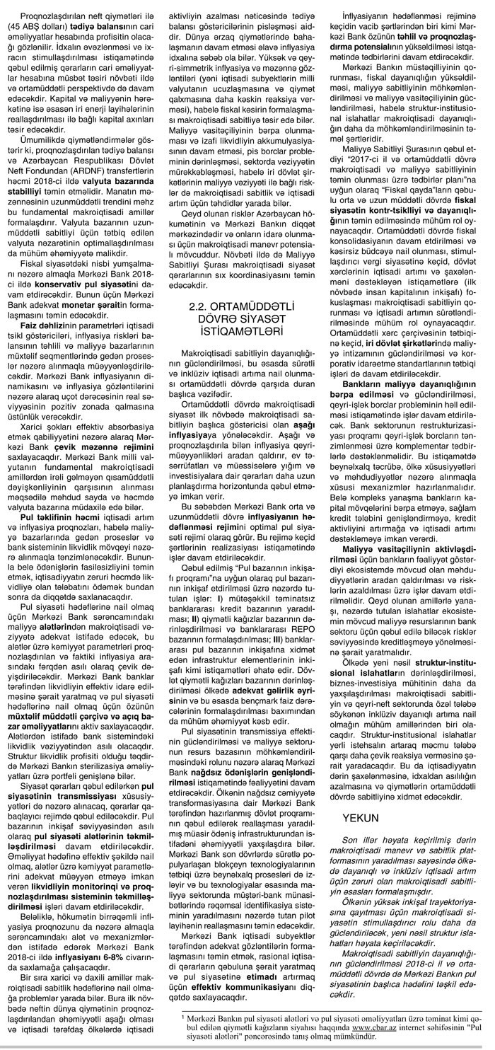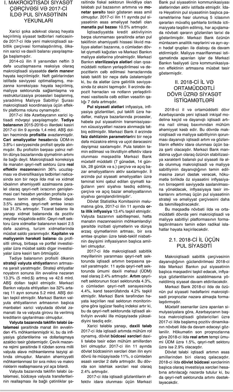 Fiskal siyasətdəki nisbi yumuşalmanı nəzərə almaqla Mərkəzi Bank 2018-ci ildə də konservativ (mühafizəkar) pul siyasətini davam etdirəcəkdir. Bunun üçün Mərkəzi Bank adekvat monetar şəraitin formalaşmasını təmin edəcəkdir.