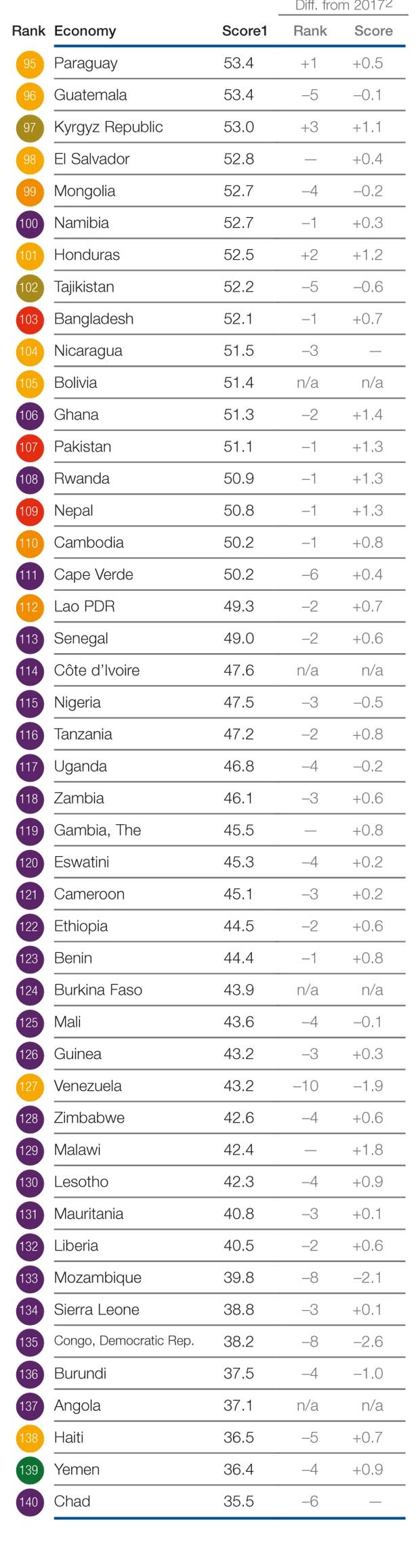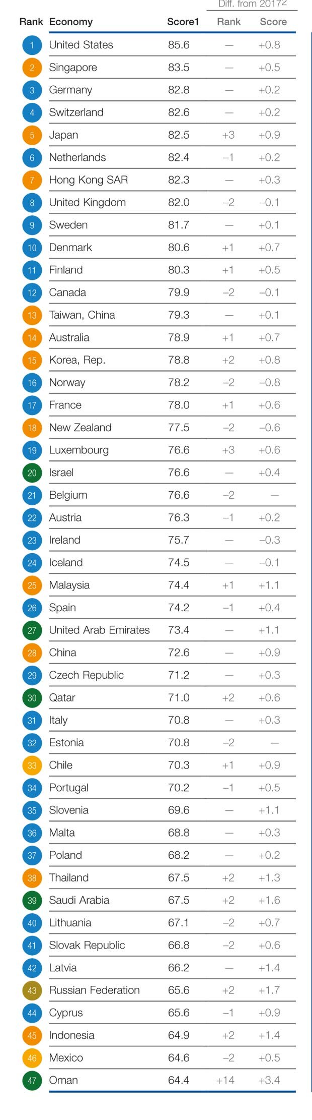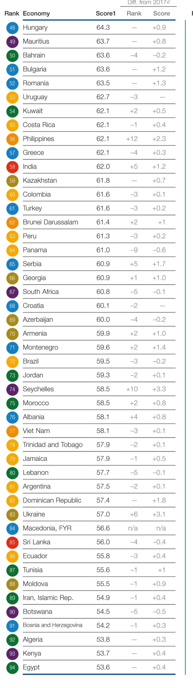 Honq Konq 82,3 bəndlə bu il 7-nci sıradakı yerini qoruyub. İngiltərə isə iki pillə geriləyərək 82 bəndlə 8-inci yeri tutub.
