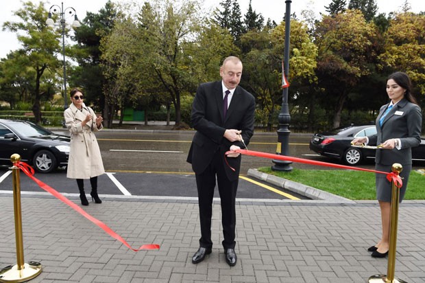 Dövlətimizin başçısı inzibati binanın rəmzi açılışını bildirən lenti kəsib.