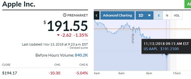 3 Oktyabr 2018-ci il tarixində Apple-ın səhminin qiyməti 232 dollara qalxmışdı. 13 Noyabr 2018-ci il tarixində isə 16.3 faiz azalma ilə 191 dollar səviyyəsinə qədər düşüb.