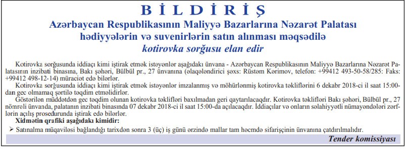 Maliyyə Bazarlarına Nəzarət Palatası hədiyyələrin və suvenirlərin satın alınması məqsədilə kotirovka sorğuisu elan edib.