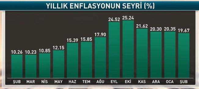 Türkiyə Statistika Komitəsinin məlumatlarına görə, Fevralda İstehlakçı Qiymətləri İndeksi aylıq müqayisədə 0.16%, illik müqayisədə 19.67% artıb.