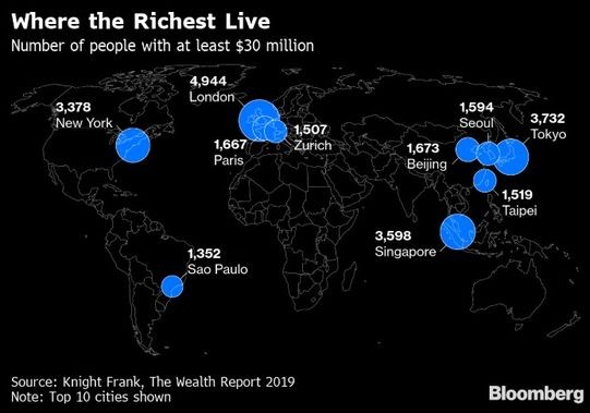 "Knight Frank"ın "Varlılar 2019" hesabatına görə, ən azı 30 milyon dollar sərvəti olan dünyanın ən varlılarının az qala yarısı London, Tokio və Sinqapurun başda olduğu 10 şəhərdə yaşayır.