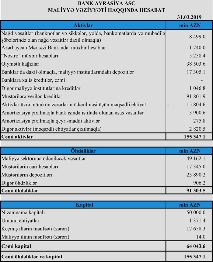 31 Mart 2019-cu il tarixində "Bank Avrasiya" ASC 155 milyon 347 min manat cəmi aktivlərə, o cümlədən, 91 milyon 802 min manat kredit portfelinə malik olub.