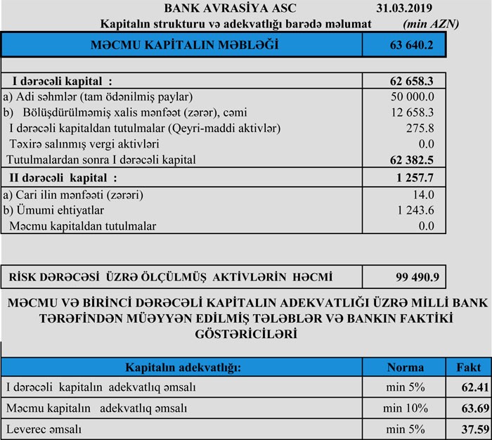 Müqayisə üçün qeyd edək ki, 2018-ci ilin yanvar-mart dövründə "Bank Avrasiya"nın cəmi gəlirləri 3 milyon 326 min manat, cəmi xərcləri 1 milyon 711 min manat təşkil etmiş və 1 milyon 615 min manat əməliyyat mənfəəti formalaşmışdı. Eyni zamanda, ehtiyatlardan (kredit və depozit itkiləri üzrə yaradılmış ehtiyat) 1 milyon 617 min manat gəlirə çevrilmiş və nəticədə bankın mənfəəti 3 milyon 233.7 min manata yüksəlmişdi.