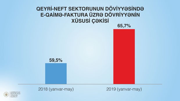 Şəffaflaşmanı əks etdirən daha bir mühüm indikator e-qaimə ilə rəsmiləşən dövriyyələrin artımıdır. 2019-cu ilin 5 ayında ötən ilin müvafiq dövrü ilə müqayisədə qeyri-neft sektorunda elektron qaimə-faktura ilə rəsmiləşən dövriyyənin cəmi dövriyyədə xüsusi çəkisi 59,5 faizdən 65,7 faizə yüksəlib. Qeyri-neft sektorunda elektron qaimə-faktura ilə rəsmiləşən dövriyyənin artan məbləğinin 81,3 faizi ticarət və sənayenin payına düşüb. Bu sektorda dövriyyənin nominal artım tempinin ÜDM-in nominal artımı tempini üstələməsi, e-qaimə ilə rəsmiləşən dövriyyənin xüsusi çəkisinin artması gəlirlərin şəffaflaşması və əqdlərin sənədləşməsi səviyyəsinin yüksəlməsini göstərir ki, bu da “kölgə iqtisadiyyatı”nın həcminin azalmasına işarə edir.