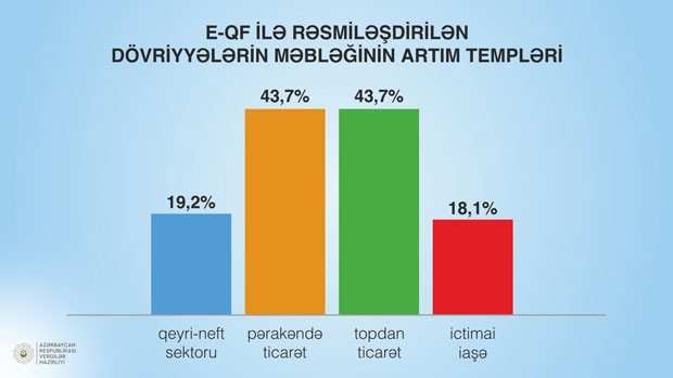 Elektron qaimə-faktura ilə rəsmiləşən dövriyyənin artım tempi həm topdansatış ticarətdə, həm də pərakəndə ticarətdə 43,7 faizə çatıb. Elektron qaimə-faktura ilə rəsmiləşən dövriyyənin həcmində ən yüksək artım templəri kənd təsərrüfatında (91,8 faiz), ticarətdə (43,7 faiz), rabitədə (24,2 faiz), sənayedə (16,9 faiz) və digər fəaliyyət sahələrində (29,9 faiz) müşahidə olunur. Bütün fəaliyyət sahələrində elektron qaimə-faktura ilə rəsmiləşən dövriyyənin cəmi dövriyyədə xüsusi çəkisinin artması qeydə alınıb.