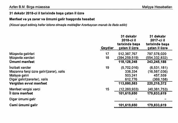 “Marja” şirkətin illik hesabatına istinadən xəbər verir ki, xalis mənfətin düşməsi müqavilə gəlirlərinin azalması ilə bağlıdır. 2017-ci ildə müqavilələr üzrə gəlirlər 797 milyon 578 min manat ikən, 2018-ci ildə 512 milyon 388 min manata düşüb (285 milyon 191 min manat və ya 35,7% azalıb).