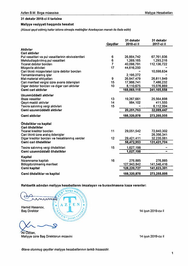 2018-ci ildə 2017-ci illə müqayisədə “Azfen”in cəmi aktivləri 31% azalaraq 273 milyon 255 min manata geriləyib.
