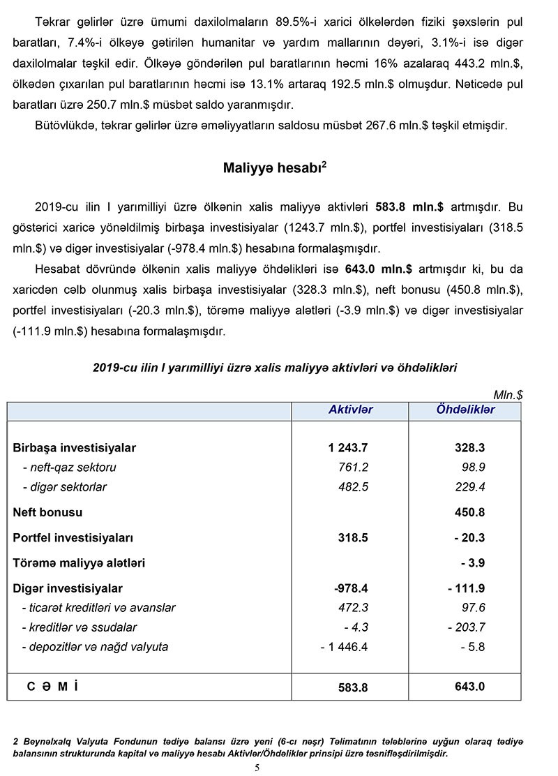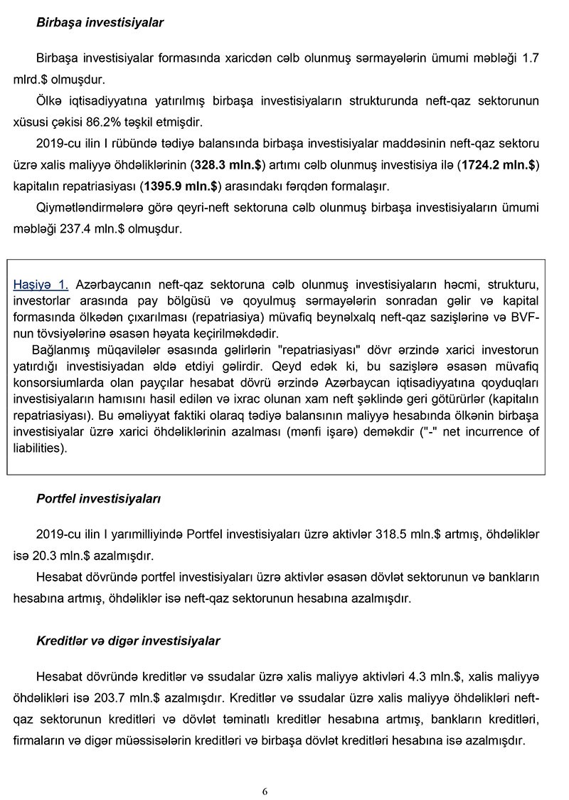 2019-cu ilin 1-ci yarısında Azərbaycanın tədiyə balansında 3 milyard 635 milyon dollar profisit yaranıb.
