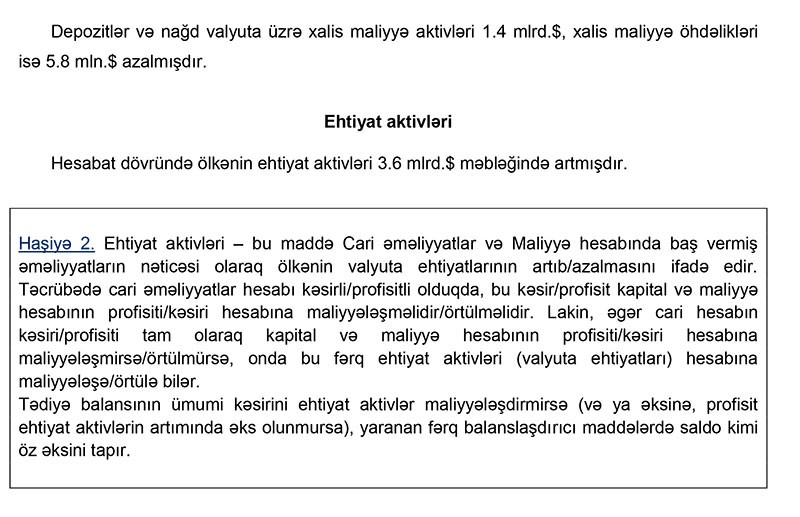 “Marja” Mərkəzi Bankın açıqlamasına istinadən xəbər verir ki, 2019-cu ilin 1-ci yarımilliyi üzrə tədiyə balansının ümumi profisiti həm neft qiymətinin yüksək olması, həm də Cari Əməliyyatlar Balansında yaranmış müsbət tendensiyalar hesabına formalaşmışdır. Cari Əməliyyatlar Balansında yaranmış 3.1 mlrd. dollarlıq profisit ehtiyat aktivlərinin 3.6 mlrd.dollar artmasını şərtləndirmişdir.