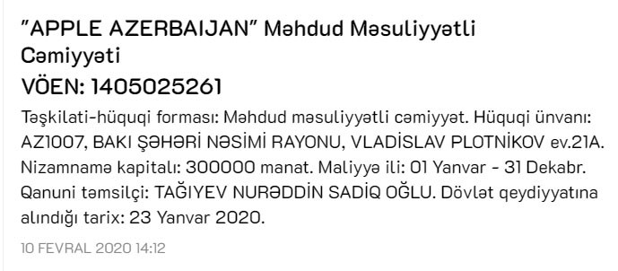 Vergilər Nazirliyi "Apple Azerbaijan" MMC-ni dövlət qeydiyyatına alıb.