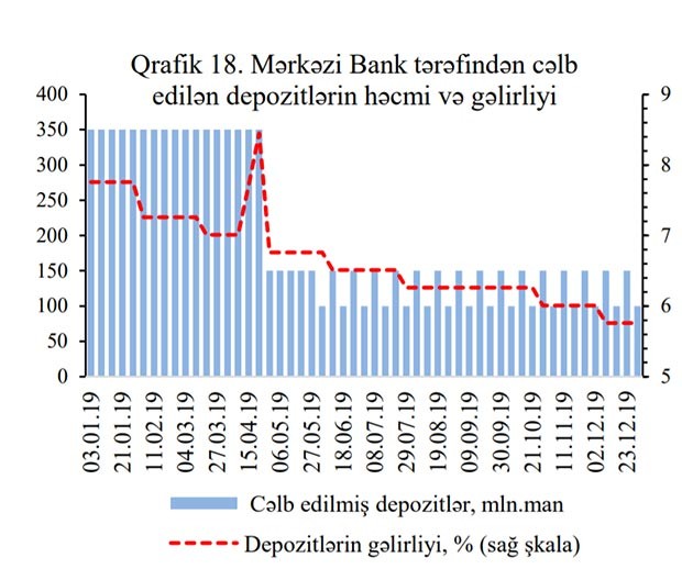 2019-cu ildə Mərkəzi Bank milli valyutada sərbəst vəsaitlərin cəlb olunması üzrə 53 depozit hərracı keçirmişdir. Depozit əməliyatları vasitəsilə vəsaitlər 14 gün müddətinə cəlb edilmişdir. İlin sonuna depozit əməliyyatları ilə cəlb edilmiş vəsaitlərin qalığı 250 milyon manat təşkil etmişdir.