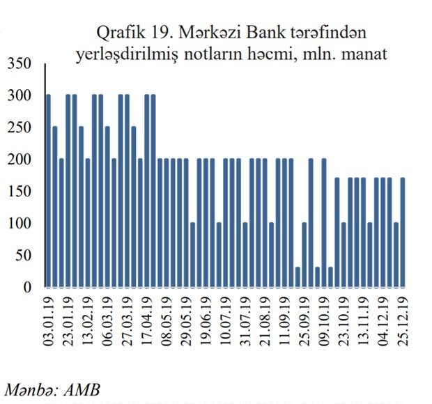 Depozit əməliyyatları ilə yanaşı, Mərkəzi bank 2019-cu ildə notların yerləşdirilməsi üzrə 55 hərrac keçirmişdir. Bunlardan 51-də 28 günlük notlar yerləşdirilmişdir. Mərkəzi Bank 2019-cu ilin sentyabr ayından etibarən izafi likvidliyin sterilizasiya imkanlarının artırılması və gəlirlilik əyrisinin qısamüddətli dövrünü əhatə edən hissəsində faizlərin formalaşmasını dəstəkləmək məqsədilə dövriyyəyə daha uzunmüddətli (84 gün, 168 gün, 252 gün) notların buraxılmasına başlamışdır. 2019- cu ildə 4 uzunmüddətli not hərracı keçirilmişdir ki, bununla da 120 mln. manat cəlb edilmişdir. Ümumilikdə ilin sonuna qısamüddətli notlar vasitəsilə sterilizasiyanın toplam qalığı 700 milyon manat təşkil etmişdir.