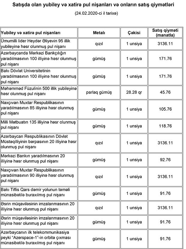 Mərkəzi Bank yubiley və xatirə pul nişanları satır - QİYMƏTLƏR