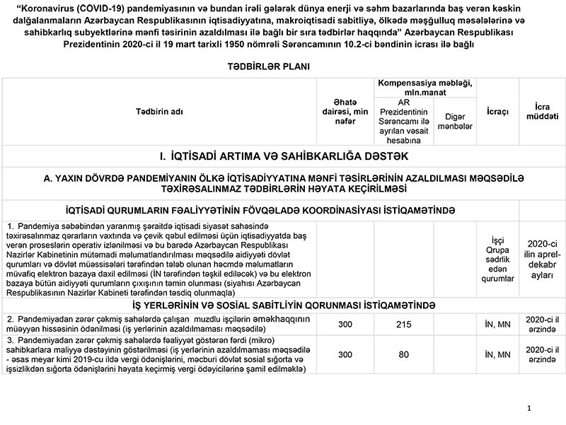 Nazirlər Kabineti “Koronavirus (COVID-19) pandemiyasının və bundan irəli gələrək dünya enerji və səhm bazarlarında baş verən kəskin dalğalanmaların Azərbaycan Respublikasının iqtisadiyyatına, makroiqtisadi sabitliyə, ölkədə məşğulluq məsələlərinə və sahibkarlıq subyektlərinə mənfi təsirinin azaldılması ilə bağlı bir sıra tədbirlər haqqında” Azərbaycan Respublikası Prezidentinin 2020-ci il 19 mart tarixli 1950 nömrəli Sərəncamının 10.2-ci bəndinin icrası ilə bağlı Tədbirlər Planı”nı təsdiq edib.