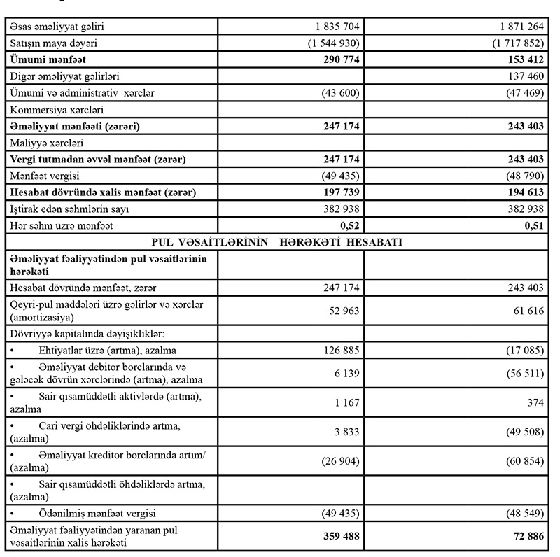 Müqayisə üçün qeyd edək ki, 2018-ci ildə “Bakı Neft-Mədən Avadanlıqları”nın əsas əməliyyat gəlirləri 1 milyon 871 min manat, digər əməliyyat gəlirləri 137 min manat, xərcləri 1 milyon 765 min manat, əməliyyat mənfəəti 243 min manat, mənfəət vergisi ödəməsi 49 min manat təşkil etmişdi.