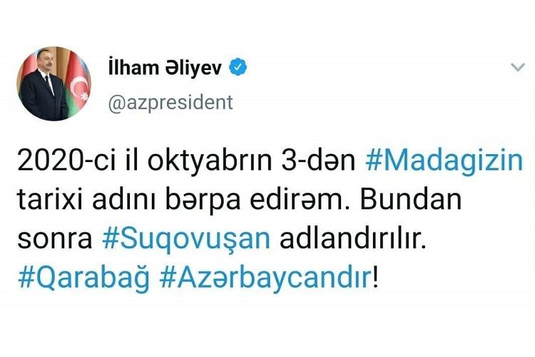 2020-ci il oktyabrın 3-dən Madagizin tarixi adını bərpa edirəm. Bundan sonra Suqovuşan adlandırılır. Qarabağ Azərbaycandır!