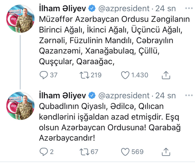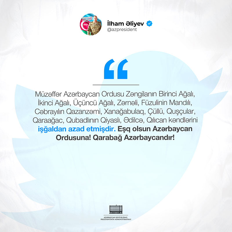 Müzəffər Azərbaycan Ordusu Zəngilanın Birinci Ağalı, İkinci Ağalı, Üçüncü Ağalı, Zərnəli, Füzulinin Mandılı, Cəbrayılın Qazanzəmi, Xanağabulaq, Çüllü, Quşçular, Qaraağac, Qubadlının Qiyaslı, Ədilcə, Qılıcan kəndlərini işğaldan azad etmişdir. Eşq olsun Azərbaycan Ordusuna! Qarabağ Azərbaycandır!