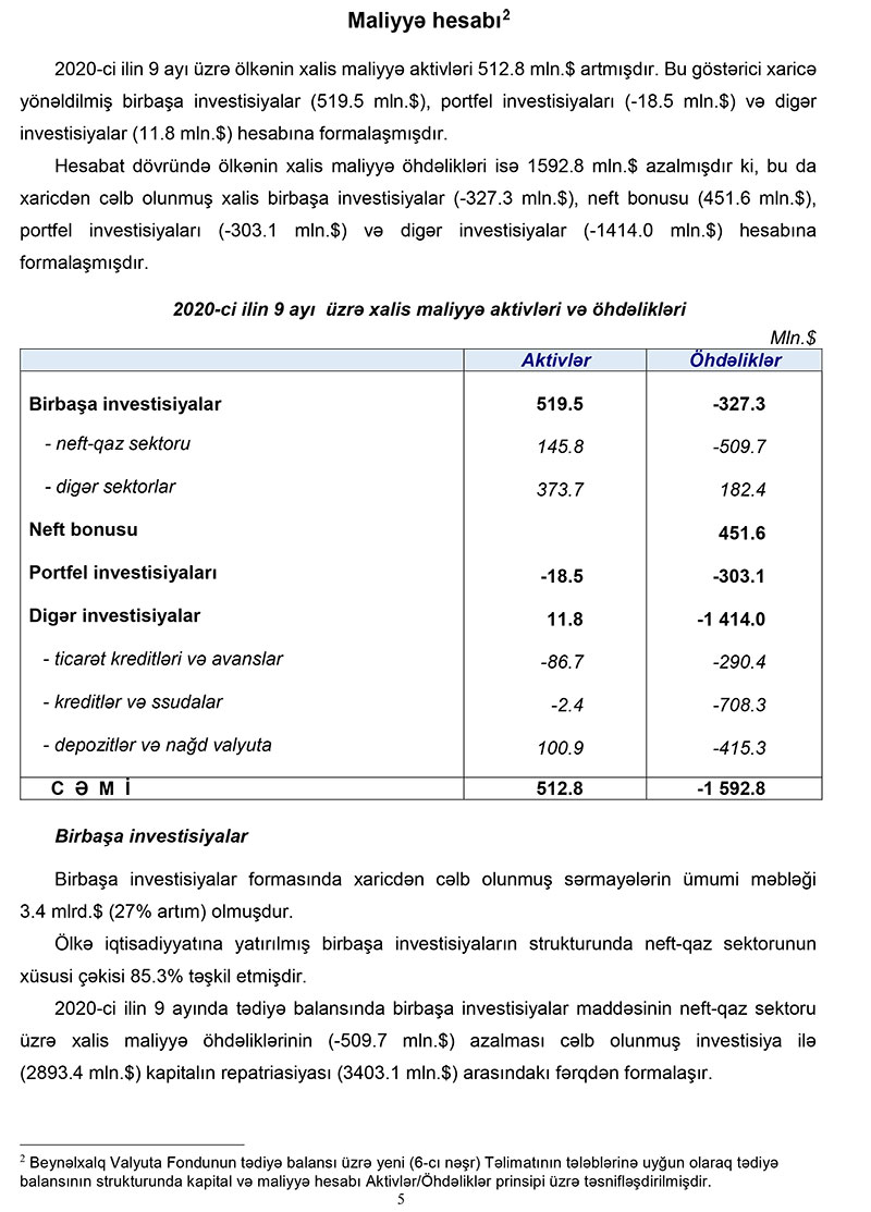 Qeyd edilib ki, xarici mühitin əlverişsiz olduğu bir şəraitdə 2020-ci ilin 9 ayında tədiyə balansının əsas komponenti olan cari əməliyyatlar balansı (CƏB) tarazlığa yaxın olmuşdur. Tədiyə balansına əsasən ixrac qiymətlərinin dəyişimi təsir göstərmişdir. Bu dövrdə qeyri-neft sektoru üzrə CƏBin yaxşılaşması davam etmişdir. Pandemiya şəraitində qeyri-neft sektoru üzrə əmtəə və xidmət idxalının azalması tədiyə balansına tarazlaşdırıcı təsir göstərmişdir.