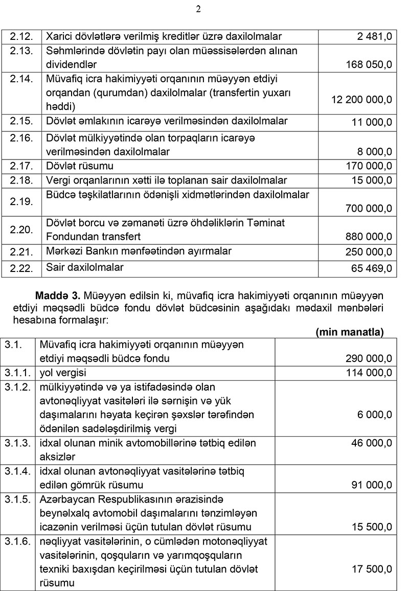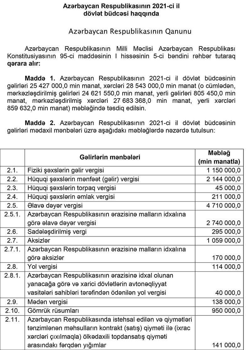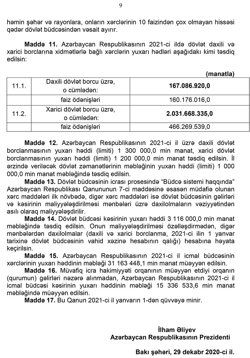 Azərbaycan Prezidenti İlham Əliyev "Azərbaycan Respublikasının 2021-ci il dövlət büdcəsi haqqında Azərbaycan Respublikasının Qanunu" imzalayıb.