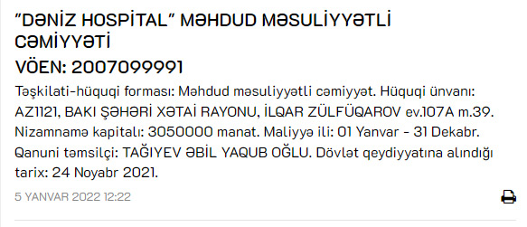 "Dəniz Hospital" şirkətinin hüquqi ünvanı Bakı, Xətai rayonu, İlqar Zülfüqarov ev.107A m.39-dur.