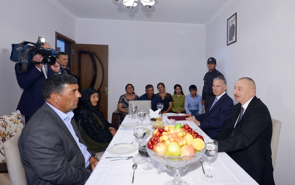 Sonra Prezident İlham Əliyev Cocuq Mərcanlı kəndinin bərpası çərçivəsində görülən işlərlə tanışlıq zamanı kənd sakini Oqtay Həziyevin evində oldu. Səkkiz nəfərlik bu ailə təhlükəli olmasına baxmayaraq, 1994-cü ilin aprelindən kənddə yaşayır və bütün məcburi köçkünlərə nümunə olmaqla yanaşı, əsl vətənpərvərlik və fədakarlıq göstərir. Birinci mərhələdə kənddə 10 hektar ərazidə 50 fərdi evin və müvafiq infrastrukturun tikintisi aparılıb. Tikilmiş evlərə Cəbrayıl rayonunun Cocuq Mərcanlı kəndindən olan və əsasən Bakı şəhərində müvəqqəti məskunlaşmış məcburi köçkünlər köçürüləcək. Ümumi sahəsi 3850 kvadratmetr olan mənzillərin 20-si ikiotaqlı, 25-i üçotaqlı, 5-i isə dördotaqlıdır.