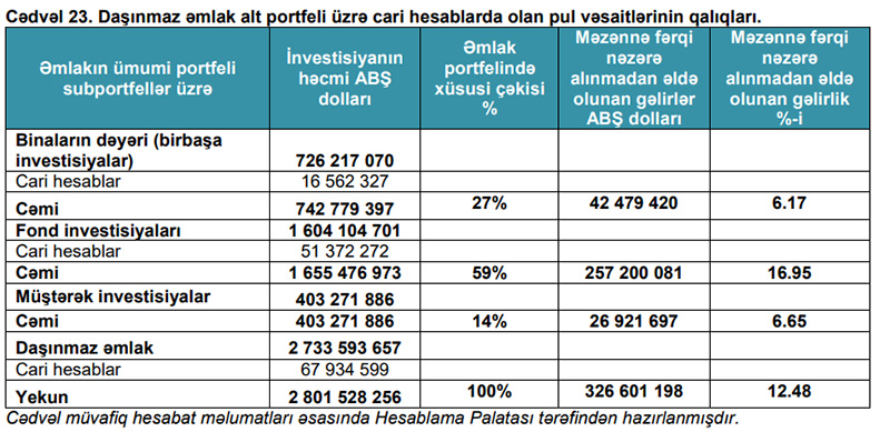 Cədvəldən göründüyü kimi, 2021-ci il 31 dekabr tarixinə daşınmaz əmlak üzrə investisiyalar 2 milyard 733 milyon 593 min 657 ABŞ dolları və bu portfel üzrə cari hesablarda olan pul vəsaitlərinin qalığı isə 67 milyon 934 min 599 ABŞ dolları təşkil etmişdir. Beləliklə, daşınmaz əmlak portfeli cari hesablarda pul vəsaitlərinin qalıqları nəzərə alaraq həmin tarixə 2 milyard 801 milyon 528 min 256 ABŞ dolları təşkil etmişdir. Daşınmaz əmlak portfelinin cari hesablarda pul vəsaitlərinin qalıqları nəzərə alınmaqla xüsusi çəkisinin 27%-i birbaşa investisiyaların, 59%-i fond investisiyaların və 14%-i müştərək investisiyaların payına düşmüşdür. Qeyd edilməlidir ki, daşınmaz əmlaka birbaşa investisiyaları üzrə gəlirlilik faizi 6,17%, fond investisiyaları üzrə 16.95%, müştərək investisiyalar üzrə isə 6,65%, ümumilikdə isə daşınmaz əmlak portfeli üzrə məzənnə fərqi nəzərə alınmadan əldə olunan gəlirlilik 12,48% təşkil etmişdir.