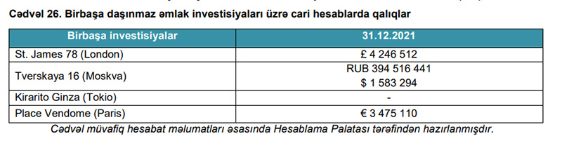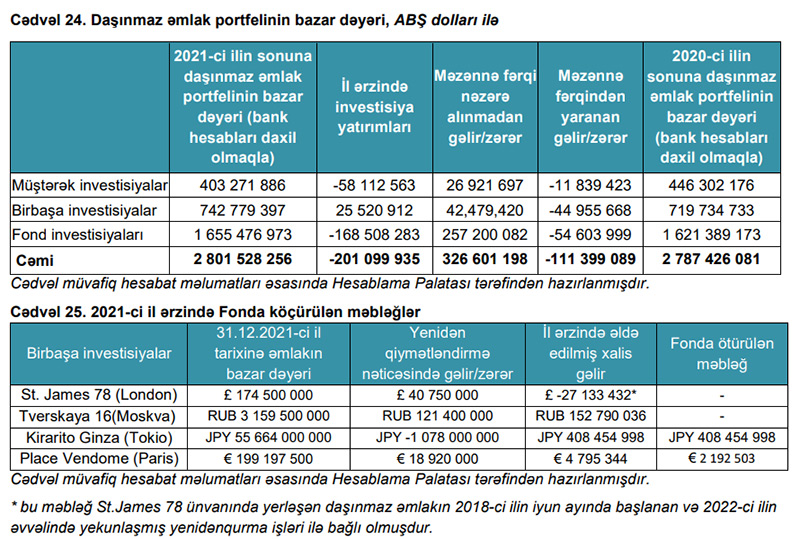 “Fond Hesabat ilində Daşınmaz əmlak alt portfelinin strukturuna daxil olan birbaşa investisiyalar üzrə 6,17% və ya 42 milyon 479 min 420 manat gəlirlilik əldə etmiş, məzənnə fərqindən yaranan zərəri isə 44 milyon 955 min 668 manat olmuşdur. Fond London şəhərinin “West End” səmtində, Seynt Ceyms 78 ünvanında yerləşən daşınmaz əmlak üzrə 2018-ci ildə başlayan və hesabat ilində də davam edən təmir işləri ilə bağlı 2021-ci ildə 27,1 milyon funt sterlinq vəsait yönəldilmişdir. Gəlirlilik göstəricisinin Daşınmaz əmlak alt portfelinin digər istiqamətləri ilə müqayisədə aşağı olması Palata tərəfindən verilən əvvəlki illərin rəylərində də qeyd edildiyi kimi birbaşa investisiya aləti üzrə daşınmaz əmlak bazarının tələblərinə uyğun mövcud iqtisadi vəziyyət nəzərə alınmaqla yeni tənzimləmə mexanizmlərinin tətbiqinə zərurət yarandığını deməyə əsas vermişdir”,- Rəydə deyilir.