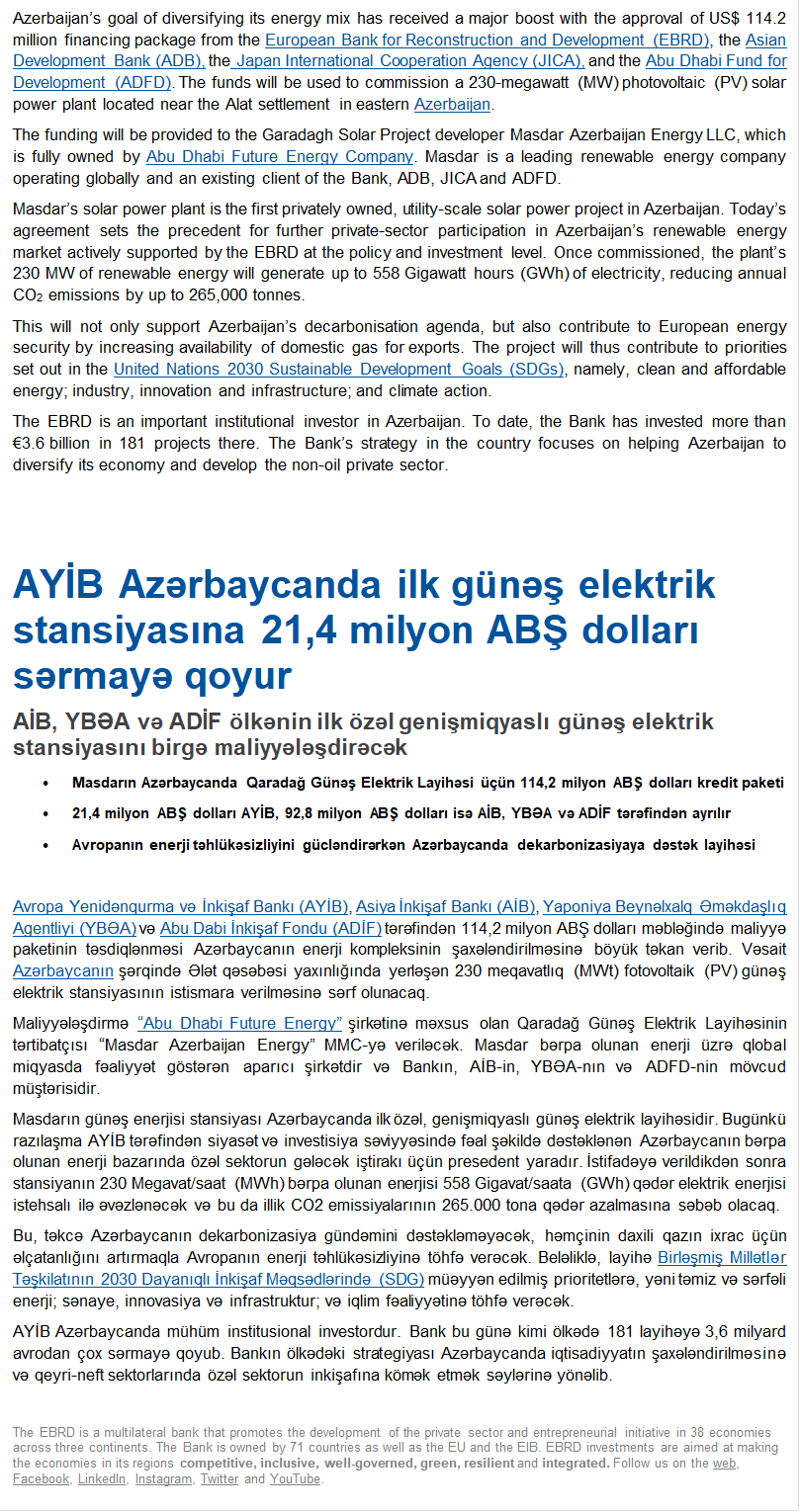 Kredit tamamilə "Abu Dhabi Future Energy" şirkətinə məxsus olan Qaradağ Günəş Layihəsinin icraçısı "Masdar Azerbaijan Energy" MMC-yə veriləcək.