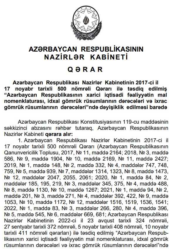 Nazirlər Kabinetinin Qərarına əsasən Pakistan İslam Respublikasından idxal edilən həmin ölkə mənşəli düyünün 31.12.2027-ci il tarixinədək idxal gömrük rüsumundan azad edildi.Pakistan İslam Respublikasından Azərbaycana idxal olunan düyü 15 faiz gömrük rüsumundan azad edilir.