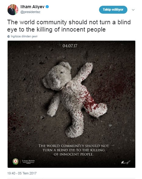 “Dünya ictimaiyyəti günahsız insanların qətlinə göz yummamalıdır”, - Azərbaycan prezidenti İlham Əliyev "Twitter" səhifəsində yazıb.