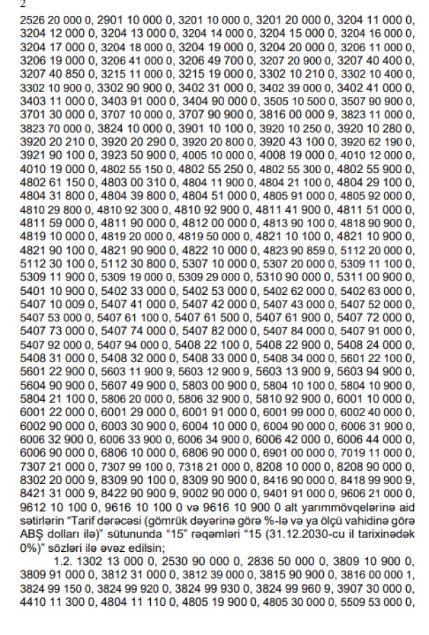 Azərbaycana idxal olunan 270 növ müxtəlif mallar 2030-cu ilin dekabrın 31-dək gömrük rüsumundan azad edilib.