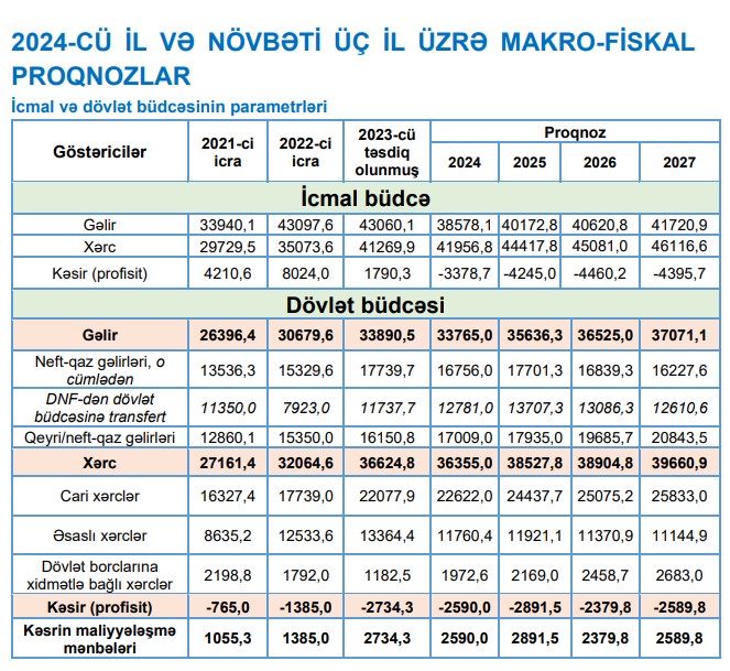 Büdcə kəsiri qarşıdakı illərdə çox dəyişməyəcək. 2023-cü ildə 2 milyard 734,3 milyon maant olacağı gözlənilən kəsirin gələn il 2 milyard 590 milyon manat, 2025-ci ildə 2 milyard 891,5 milyon manat, 2027-ci ildə isə 2 milyard 589,8 milyon manat olacağı proqnozlaşdırılır.