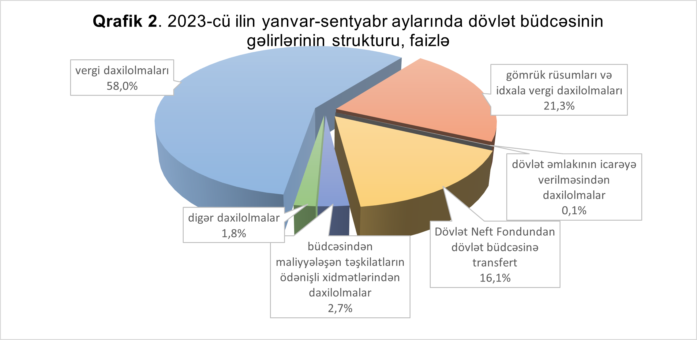 2023-cü ilin yanvar-sentyabr aylarında dövlət büdcəsinin gəlirlərində neft-qaz sektoru üzrə daxilolmaların 60,3 faizi və ya 5 milyard 396,1 milyon manatı vergi daxilolmaları, 39,7 faizi və ya 3 milyard 550,0 milyon manatı Azərbaycan Respublikasının Dövlət Neft Fondundan transfert təşkil edir. Neft-qaz sektoru vergi daxilolmalarının 62,6 faizi və 3 milyard 377,9 milyon manatı Şahdəniz qaz-kondensat yatağı üzrə mənfəət vergisi, 27,7 faizi və ya 1 milyard 494,4 milyon manatı Dövlət Neft Şirkətinin ödədiyi müvafiq vergilər, 9,7 faizi və ya 523,8 milyon manatı Azəri-Çıraq-Günəşli neft yatağı üzrə mənfəət vergisi təşkil edir.