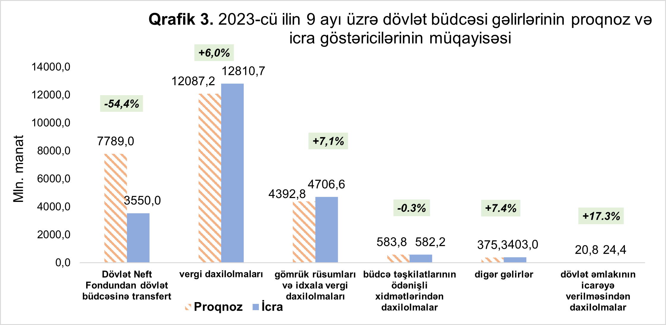 2023-cü ilin doqquz ayı ərzində dövlət büdcəsinin gəlirləri 25 milyard 248,9 milyon manat proqnoza qarşı 22 milyard 76,9 milyon manat təşkil etmişdir ki, bu da proqnozla müqayisədə 3 milyard 172,0 milyon manat və ya 12,6 faiz azdır.